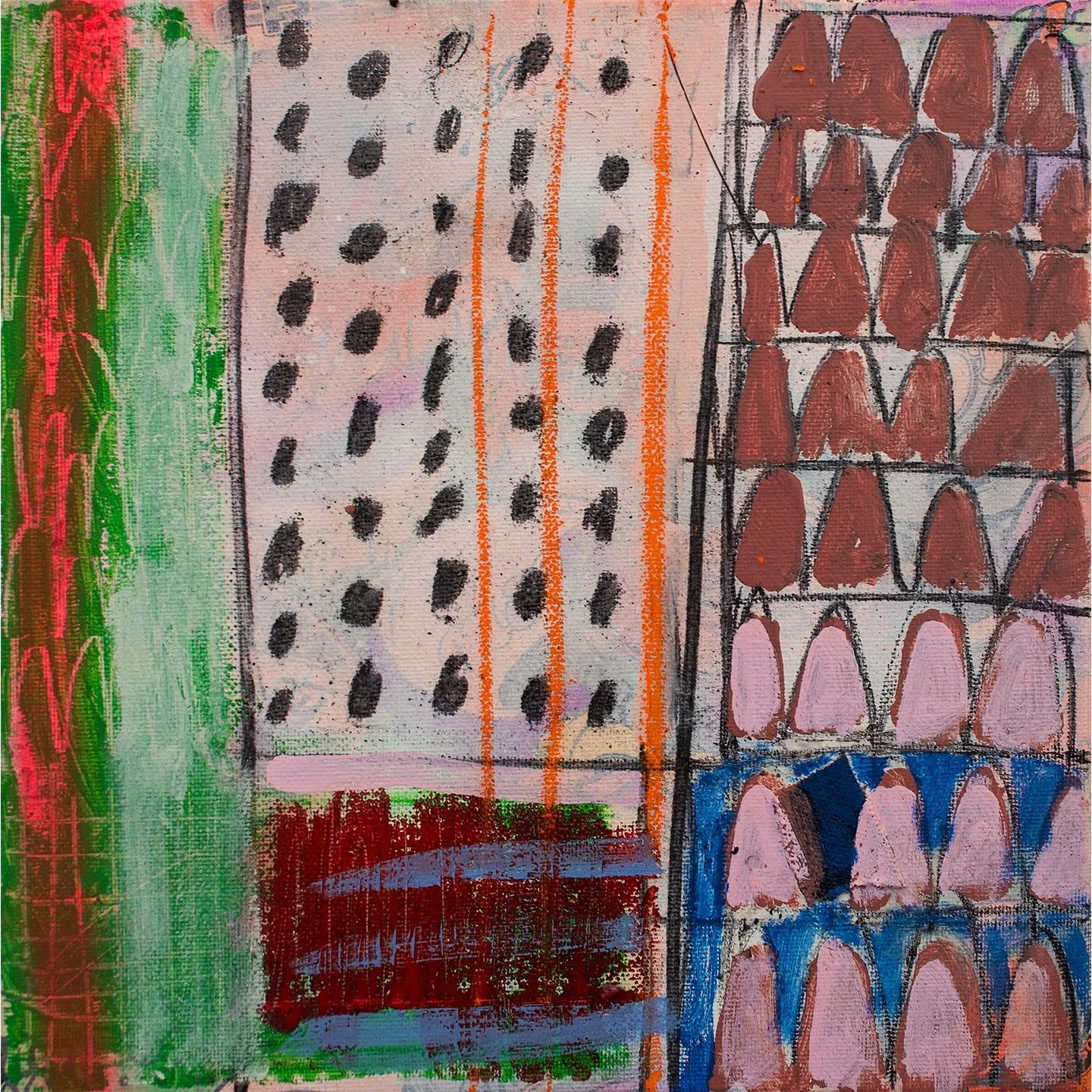 A sudden jolt of inspiration amidst the relentless rain sparked my obsession with matches in this painting. Perhaps it was the need for warmth in a cold studio, but the match-shap